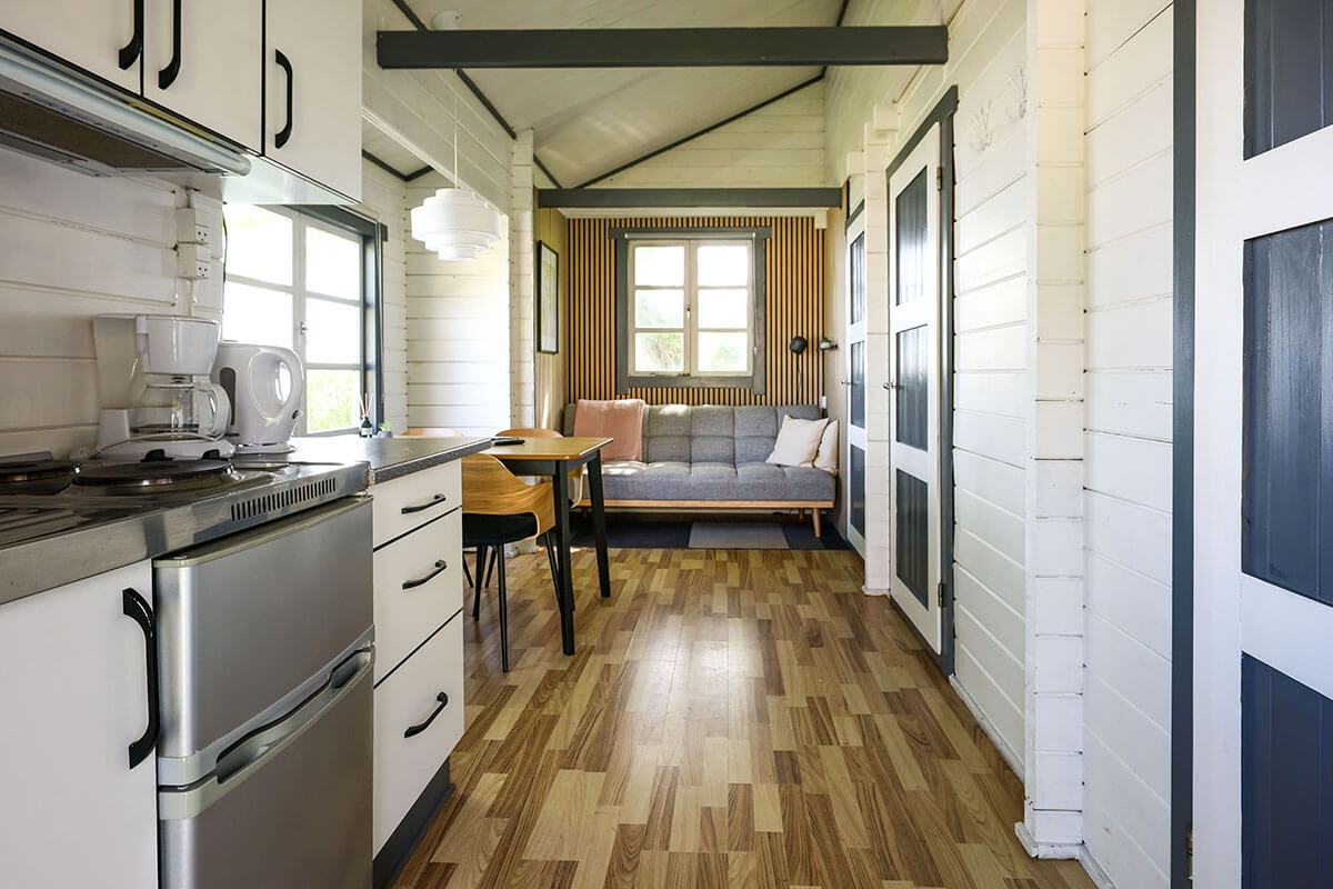 Køkken med køleskab, kogeplader, kaffemaskine, køkkenredskaber til 4 personer