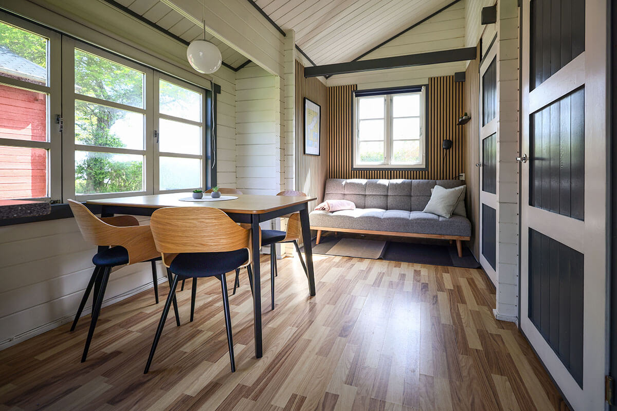 Opholdsstue med sovesofa, tv, spisebord