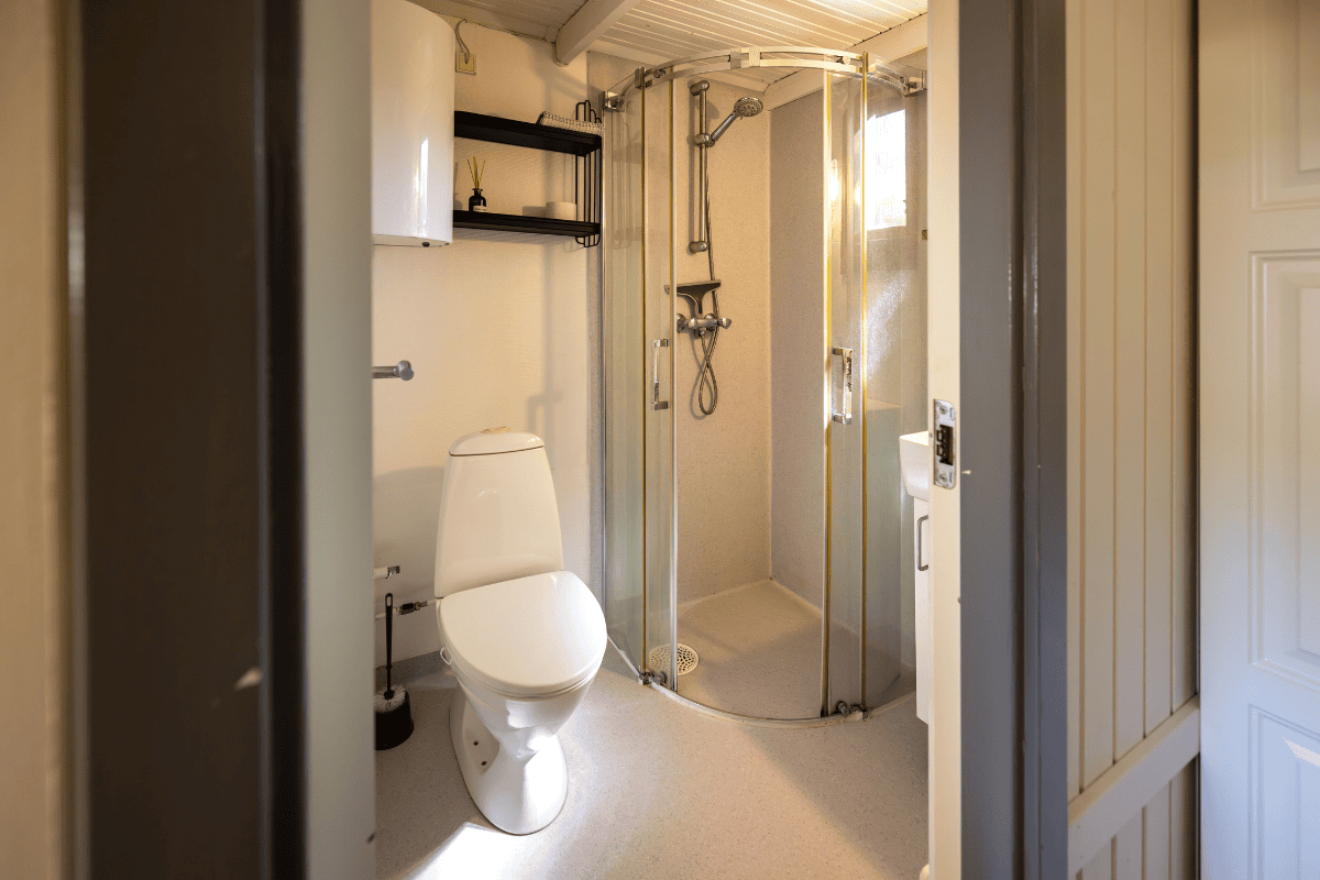1x badeværelse med bruser og toilet
